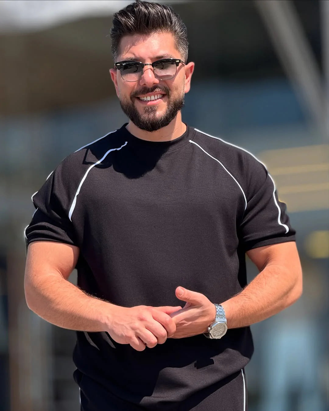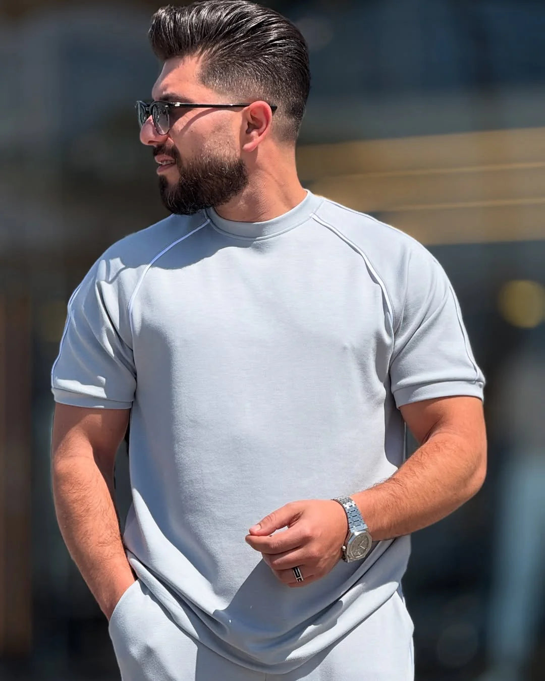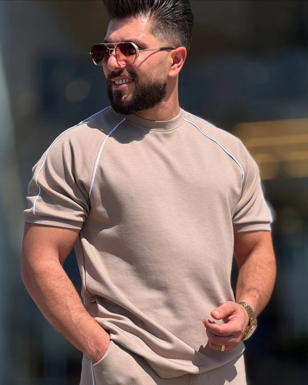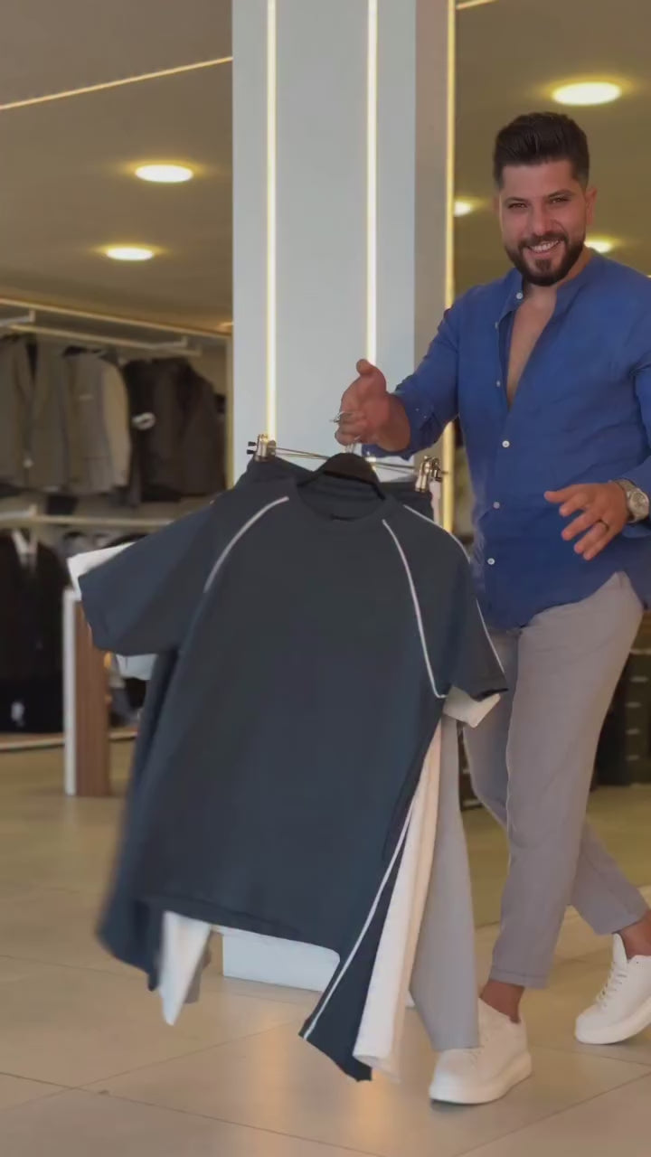 The top boasts a minimalist design with contrast piping across the shoulders and sleeves, adding a refined, sporty edge. The relaxed drop-shoulder cut and structured crew neckline lend a modern, masculine aesthetic while ensuring easy wear throughout the day. The bottom complements the top with a straight-leg fit and matching contrast side taping, creating a cohesive, clean-lined profile that elongates the frame.